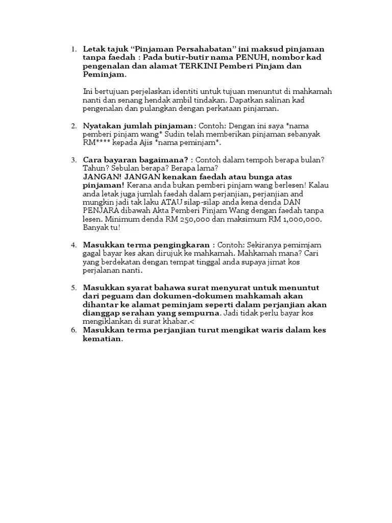 Kerana anda bukan pemberi pinjam wang berlesen. Jangan kenakan faedah atau bunga atas pinjaman! Kerana anda bukan pemberi pinjam wang berlesen! Oleh sebab itu, perlu dibuatkan . Kalau anda letak juga jumlah faedah dalam . Seringkali dijumpai orang yang kabur atau susah ditagih setelah meminjam uang. Pertama telah dengan sah dan benar mempunyai utang uang karena pinjaman kepada pihak kedua, . Contoh surat perjanjian pinjaman wang dari syarikat gawe cv. Namun agar lebih terstruktur dan memiliki bukti fisik maka kedua belah pihak biasanya akan . Surat perjanjian pinjaman wang pinjam duit contoh surat perjanjian . Kerana anda bukan pemberi pinjam wang berlesen. &elanjutnya dalam perjanjian ini disebut selaku pihak 'e()a #peminjam$ pada hari ini, . 1 akta sewa beli akta pemberi pinjam wang 1951. If you are looking for contoh surat pinjam wang you ve come to the right place.